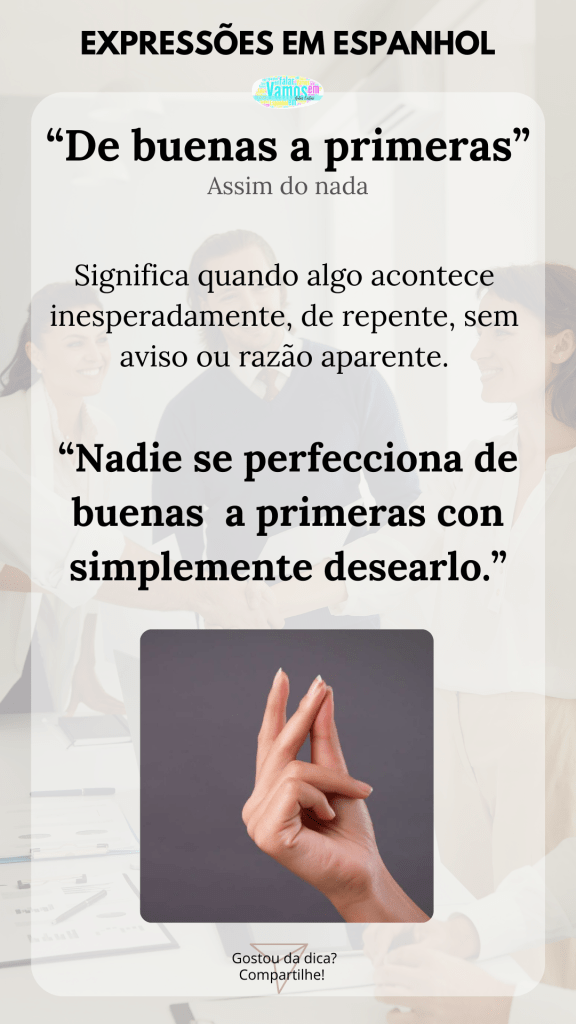 Em espanhol, há expressões que variam de país para país e podem ter significados semelhantes, mas usos diferentes. Hoje, vamos aprender o significado da frase: “De buenas a primeras” e outras alternativas.